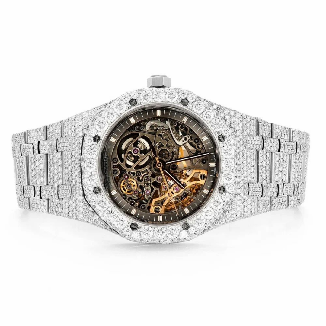 PJ AP Mens Moissanite Watch Silver Tone Exposed Movement Full Diamond Octagon Case Pave Setting Iced Watch Luxury Integrated Bracelet