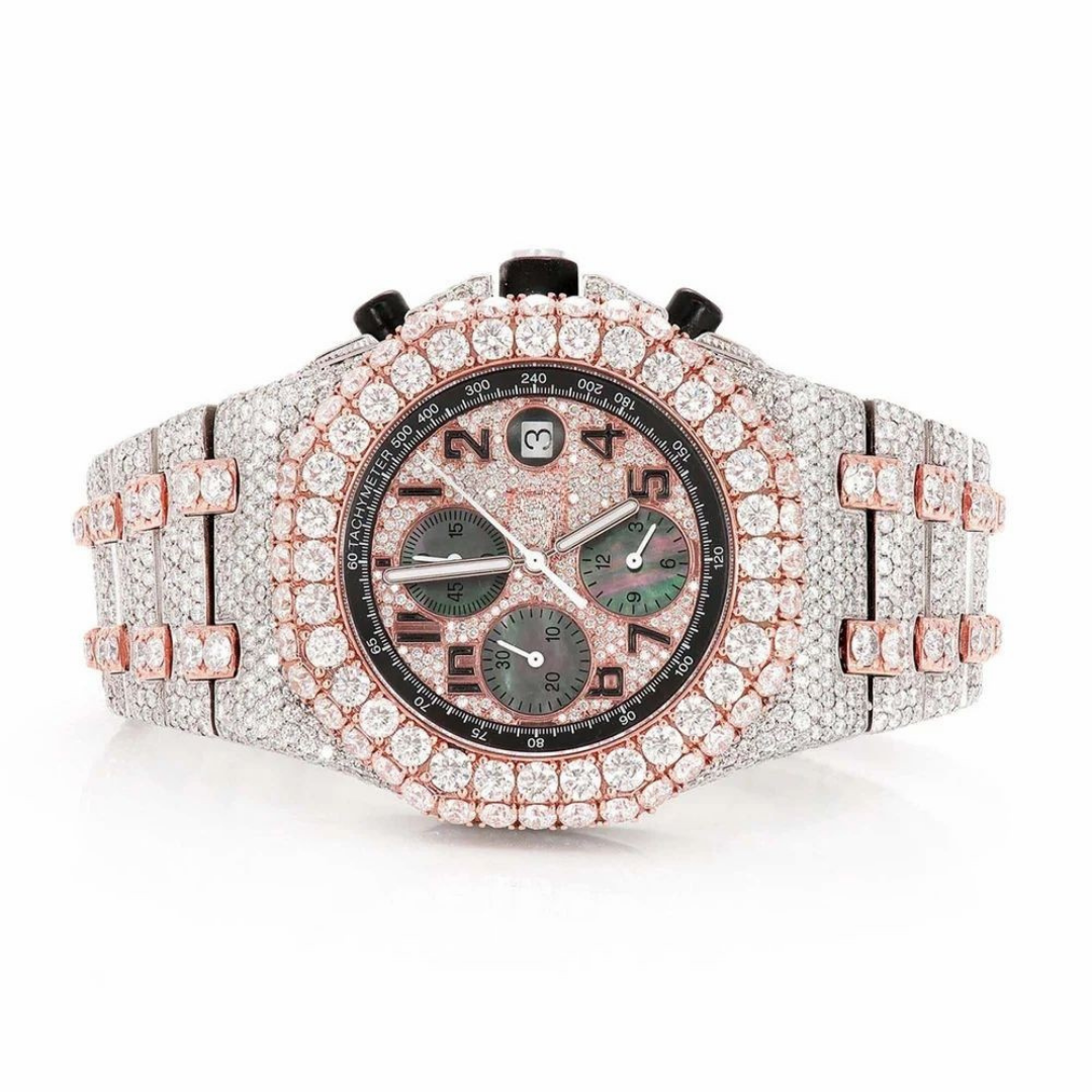 PJ AP Mens Moissanite Watch Two Tone Rose Gold Chronograph Full Diamond Pave Setting Iced Watch Luxury Sport Octagonal Integrated Bracelet