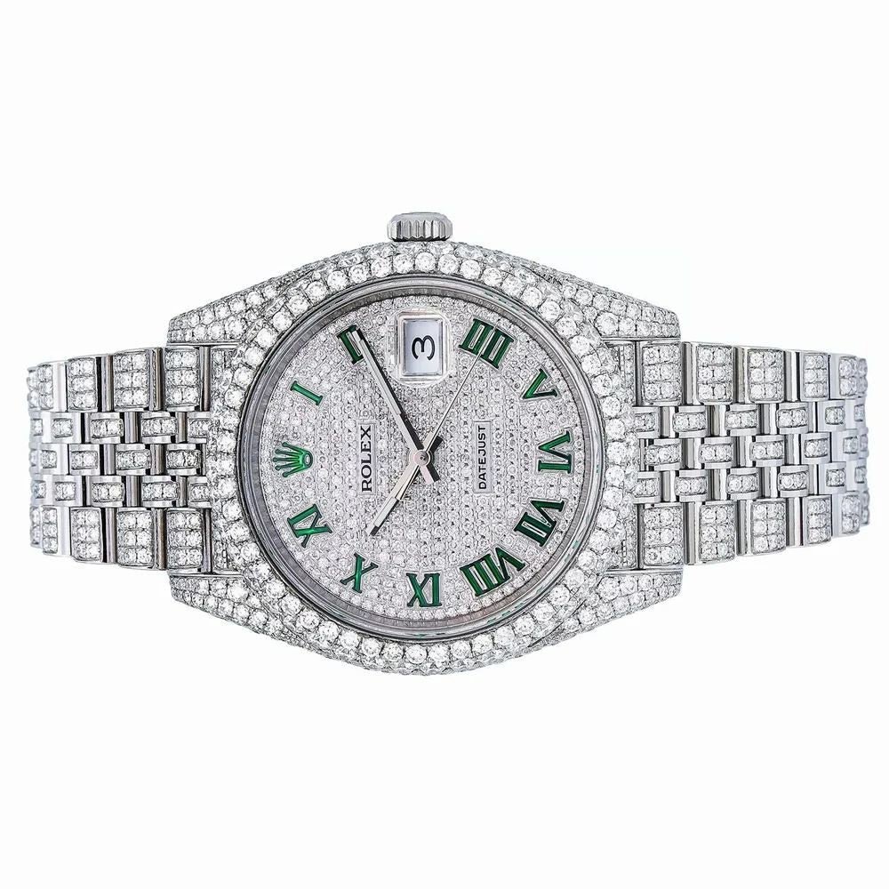 PJ R*L*X Mens Moissanite Watch Silver Tone Full Diamond Green Roman Numerals Pave Setting Iced Watch Luxury Jubilee Bracelet