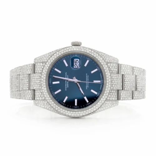 PJ R*l*x Mens Moissanite Watch Silver Tone Blue MOP Dial Full Diamond Pave Setting Iced Watch Luxury Jubilee Bracelet Diamond Markers
