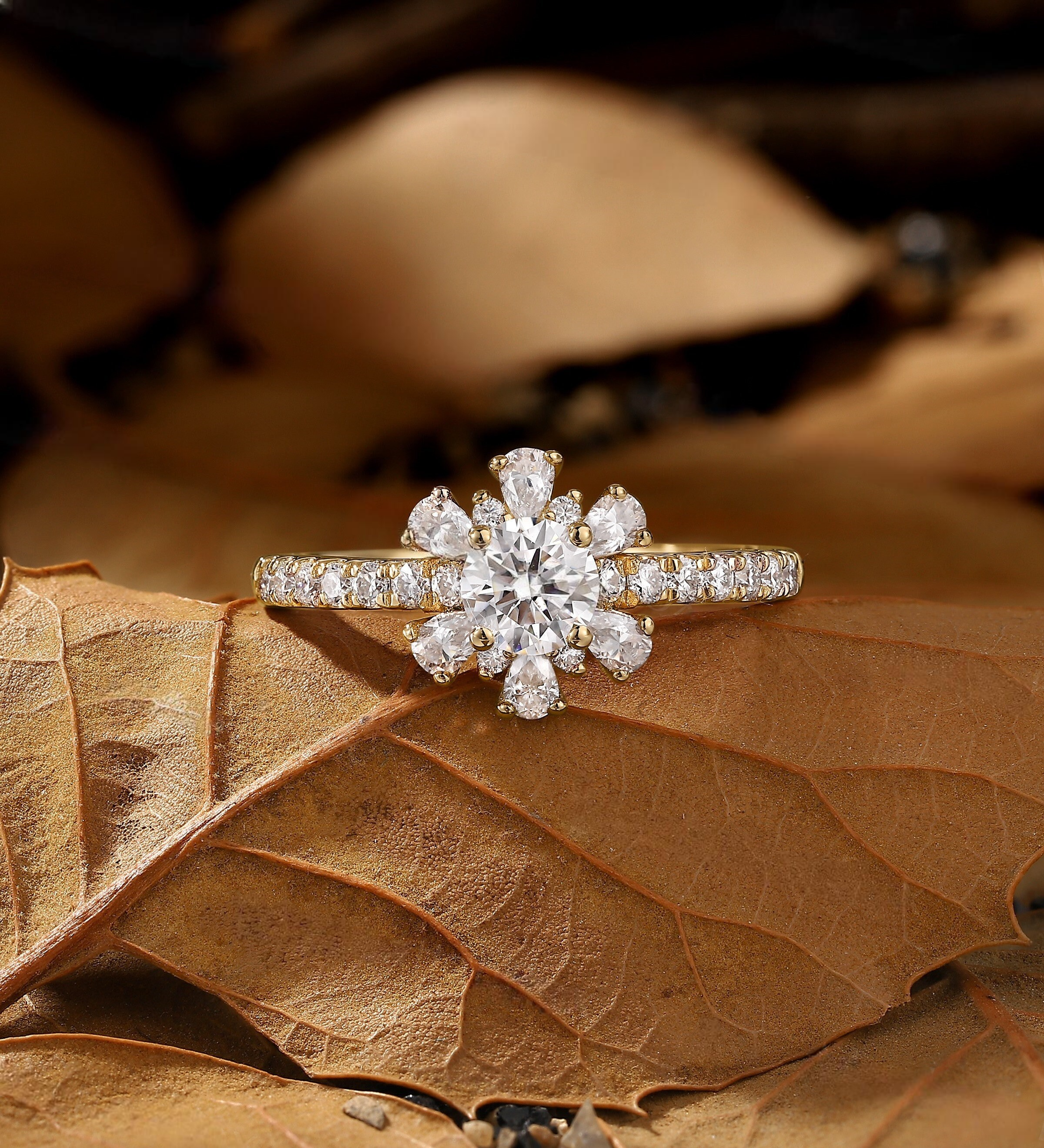 Round Lab Grown engagement ring Rose gold Vintage Pear diamond halo Bridal ring Floral half eternity pave wedding ring Anniversary