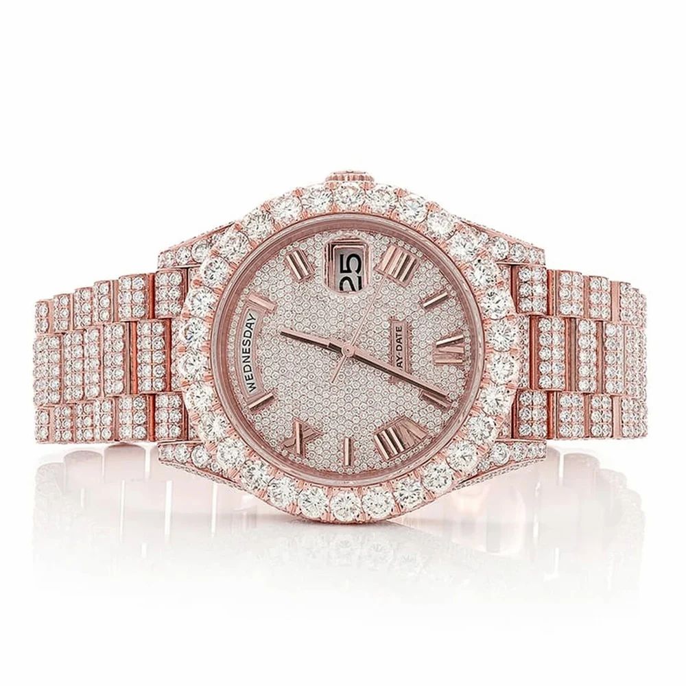 PJ R*l*x Mens Mens Moissanite Watch Rose Gold Full Diamond Pave Setting Day Date Roman Numerals Iced Watch Luxury Presidential Bracelet Monochromatic