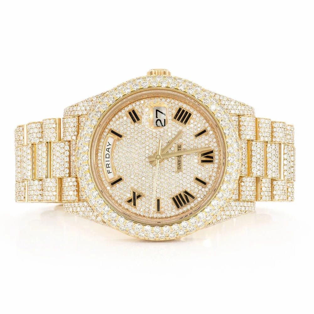 PJ R*l*x Mens Moissanite Watch Yellow Gold Full Diamond Pave Setting Day Date Roman Numerals Iced Watch Luxury Presidential Bracelet Monochromatic