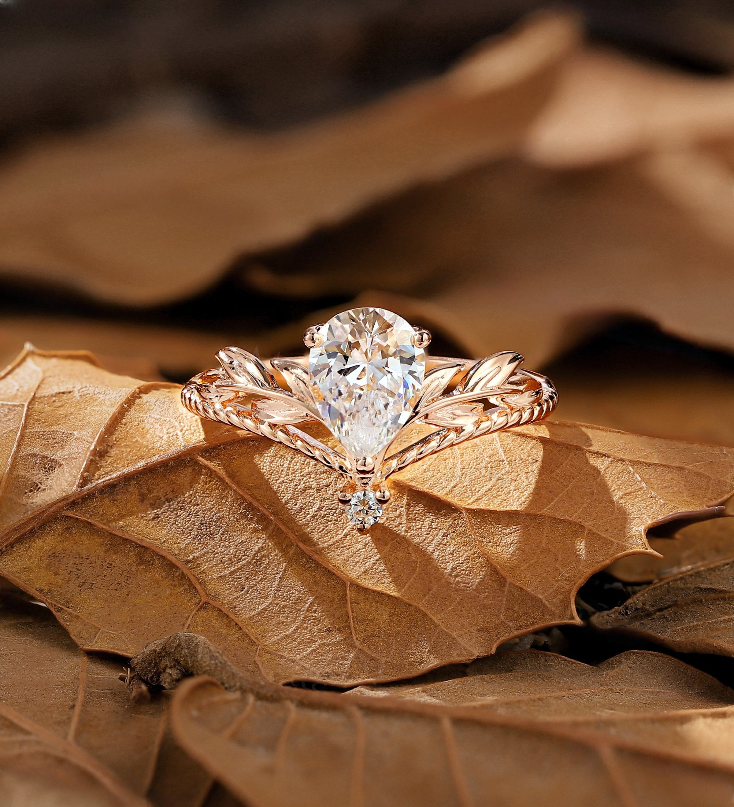 Pear Lab Grown engagement ring rose gold Vintage Branch design milgrain leaf wedding ring unique solitaire anniversary promise bridal ring